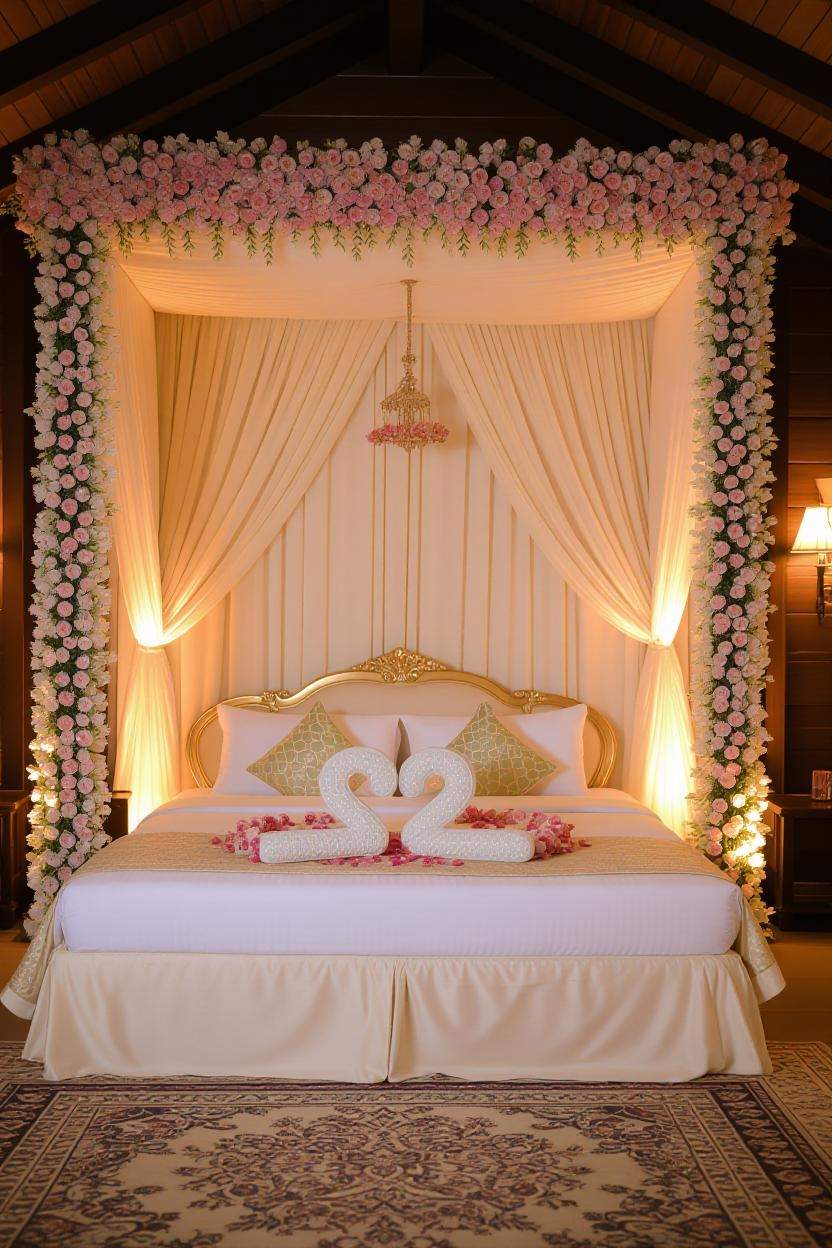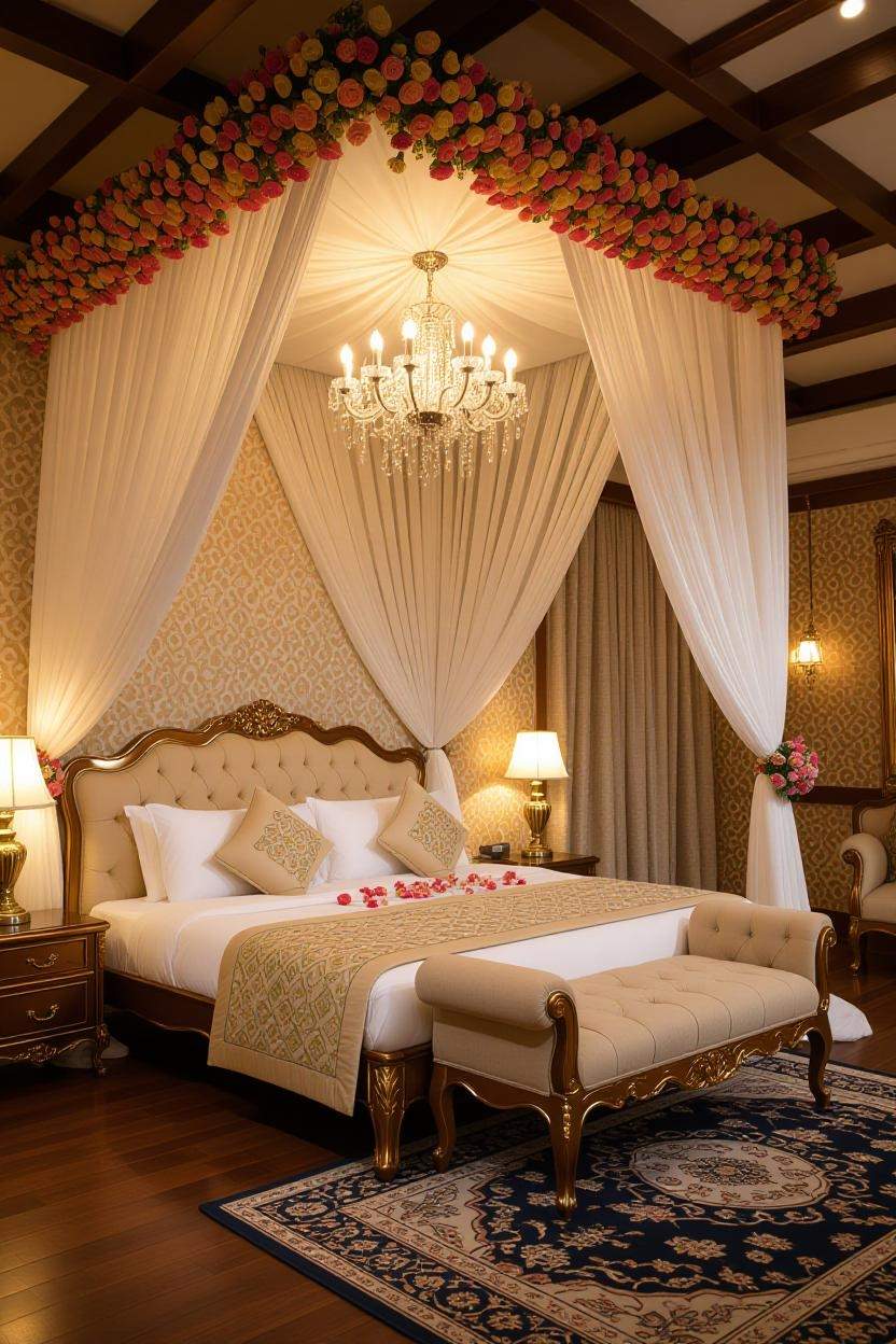 • Anniversary Room Decor: Elegant gold-white tones with “Happy Anniversary” neon signs.